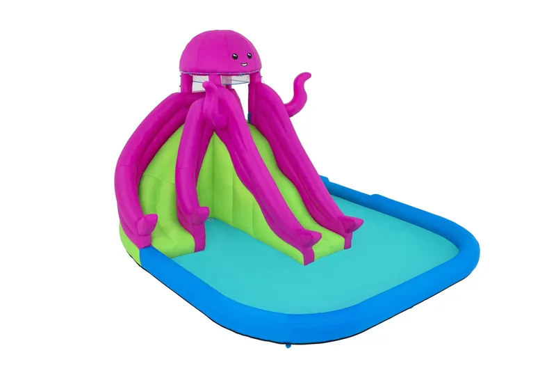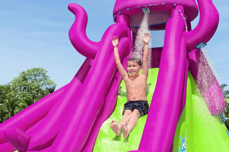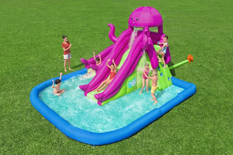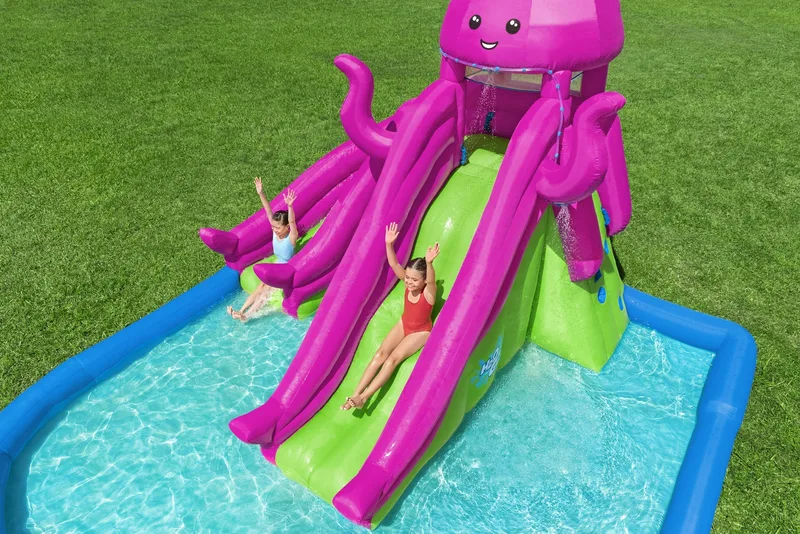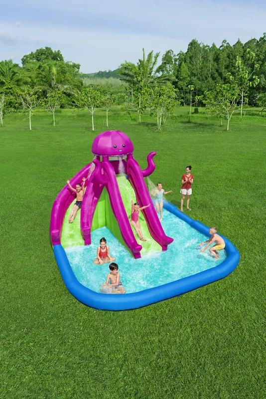 פארק המים המתנפח Bestway H2OGO! 5342R הוא מתקן מים רחב ומרשים בעיצוב תמנון צבעוני, המשלב טיפוס, גלישה ומשחק רטוב בחצר הבית.